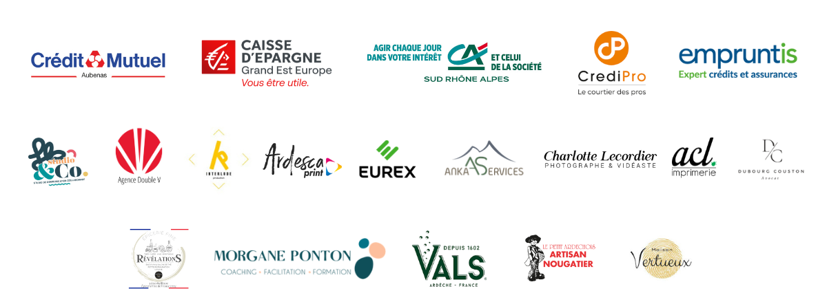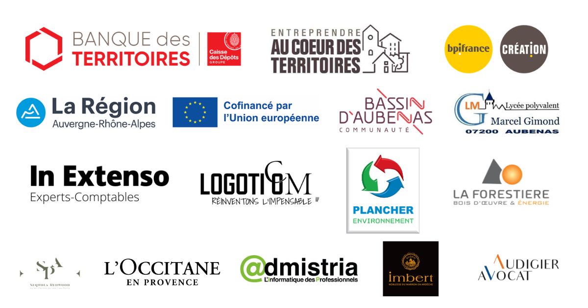 Cci de l’Ardèche, Cma de l'Ardèche, France Travail, Mission locale, CIDFF MIF, Ame Sud, Adie, 60 000 Rebonds, Initiactive 2607, Bpi, Deam, Lionel PLANCHER, Katy COUILLOUD, Bernard BLACHERE, Florian SOUBRILLARD, Richard ROCLE, Julia MIGNOT, Jacques LACOMBE, Bernard CHEVILLAT, BPI (entreprendre au cœur des territoires), Communauté de communes du bassin d’Aubenas, Eddy CHASSIER, IN EXTENSO, L’Occitane en Provence, LOGOTICOM, Les thermes de Vals les bains, PLANCHER Environnement, Mélinda SALOU, Marrons Imbert, Crédit agricole sud Rhône alpes (agence d’Aubenas), Crédit Mutuel Dauphiné Vivarais (agence d’Aubenas), Caisse d’épargne Loire Drome Ardèche, CrediPro, Empruntis