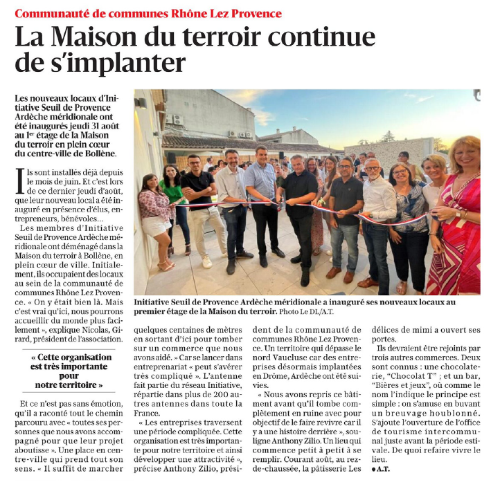 Les nouveaux locaux d’Initiative Seuil de Provence Ardèche méridionale ont été inaugurés jeudi 31 août au 1er étage de la Maison du terroir en plein cœur du centre-ville de Bollène.